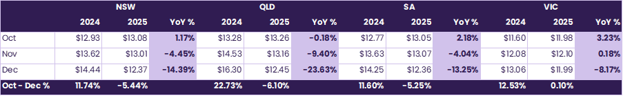 QLD prices declined further, easing from $13.16/GJ to $12.45/GJ in December, down 5.4% month-on-month. On a year-on-year basis, prices are 23.6% lower, marking the largest annual correction across the east coast. Strong supply fundamentals and softer demand continue to weigh on pricing, bringing the market closer to long-term averages.