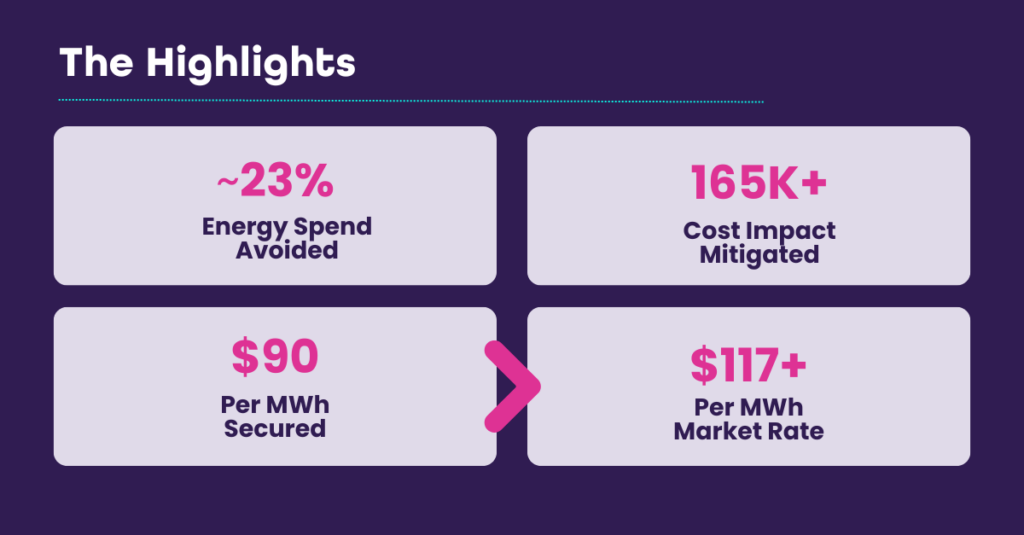 - Cost Avoidance: By acting early, the client secured a forward rate of ~$90/MWh – well below the $117+/MWh market rate at contract expiry. This avoided a 23% increase in energy spend and preserved over $160,000 in potential cost impacts.