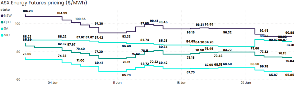 January saw a broad easing in electricity futures prices across the NEM, supported by improved supply conditions, strong renewable output and reduced near-term reliability concerns in several regions.