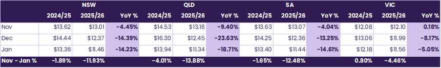 NSW gas prices averaged $11.45/GJ in January, down 14.2% year-on-year. While November pricing was relatively stable, softer outcomes in December and January drove an overall 11.9% decline across the Nov–Jan period.