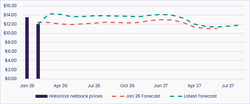 LNG netback prices remain elevated across the forward curve, with recent forecasts revised higher compared to earlier expectations. The February 2026 netback forecast of $12.45/GJ now sits above the historical netback of $12.00/GJ, reflecting stronger seasonal demand assumptions and tighter forward supply expectations.